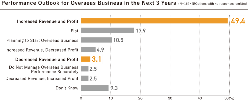 According to the Bank of Japan’s “Short-Term Economic Survey of Enterprises in Japan” released in December 2023, approximately 70% of all Japanese companies reported a “not so good” outlook. In contrast, about half of the companies in our survey view their overseas business prospects as favorable over the next three years, with only 3.1% expecting a decline in sales and profits. This indicates that overseas business can be a catalyst for further growth in Japanese companies.