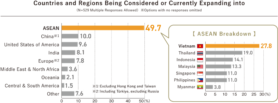 Popular Regions for Expansion: ASEAN accounted for the largest number of countries and regions where Japanese companies are considering or expanding their overseas operations, making up approximately half of the total. About 40% of respondents cited “market growth potential and future prospects” as the reason for selecting a particular country or region for expansion.